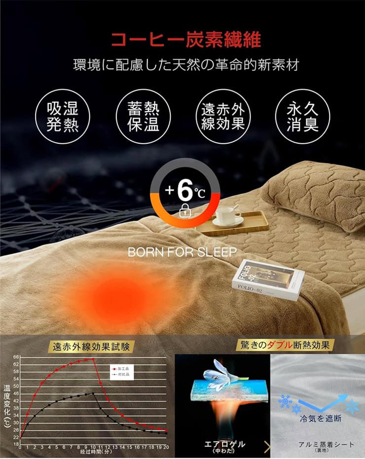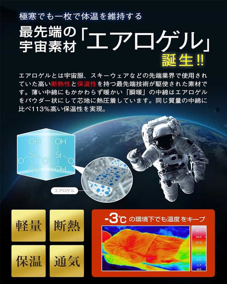 エアロゲル×アルミシートによるW断熱、2枚合わせ・6重構造、吸湿発熱、抗菌防臭防ダニ、静電気防止、襟付き、洗える仕様。