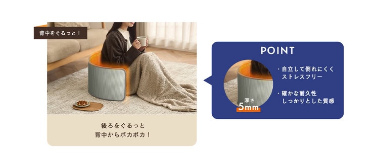 120Wのやさしい電力、360°の包み込む暖かさ、静かな使い心地、そして安全性と収納性——。