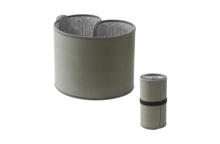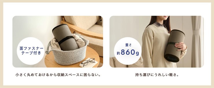 本体はわずか約860gと軽量で、サッと持ち運べます。付属のテープでくるりと丸めれば、ちょっとした袋にも入るほどコンパクトに。