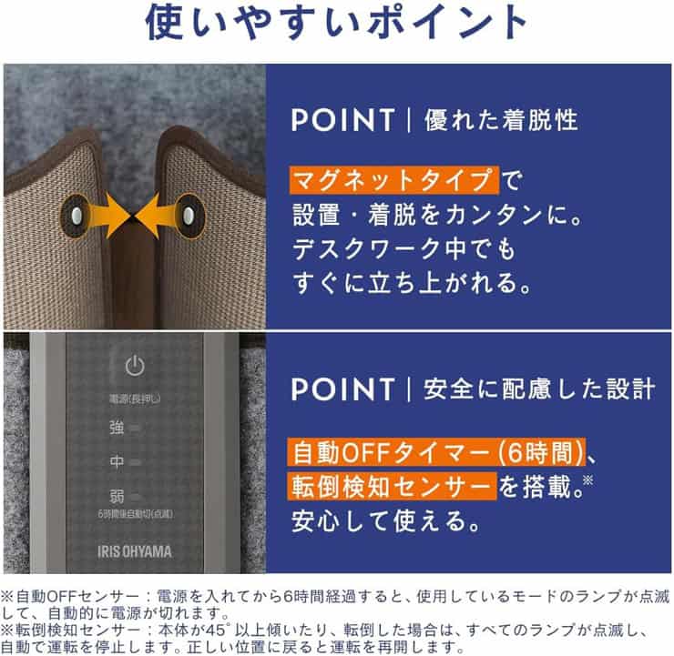 小型暖房器具を使う上で大切なのが、安全性。ぐるポカには約6時間の自動OFF機能や、転倒すると運転を停止する転倒検知センサーが備わっており、うっかりスイッチを切り忘れたり、ペットや子どもがぶつかって倒してしまった時にも安心です。デスク下は配線が多く、足を動かすことも多い場所。安全性が高いことで、「毎日使う道具」としての信頼感がぐっと増します。