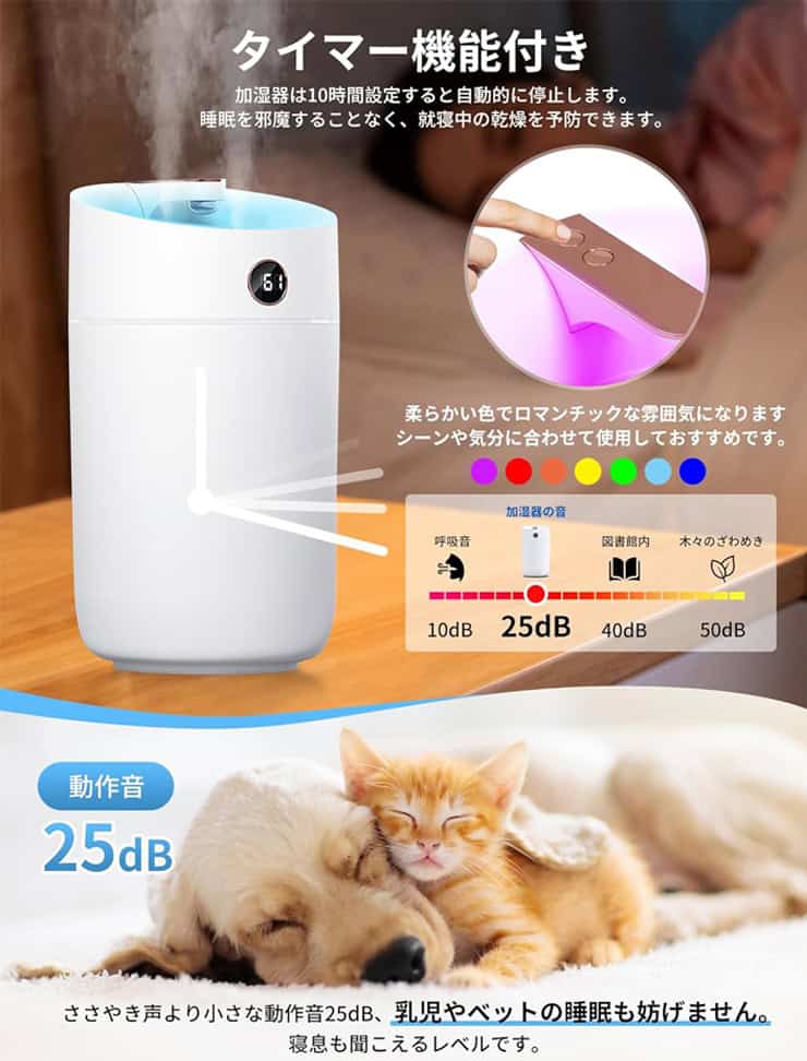 エアコンを使う季節でも、空気の乾燥をやわらげながら過ごせます。自動停止機能があることで、就寝中も気持ちに余裕が生まれます。