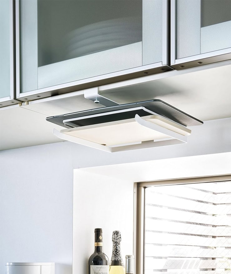 Yamazaki「Plate 戸棚下まな板ホルダー プレート(3571)」は、キッチン吊り戸棚下を有効活用したスマートなまな板・布巾収納アイテムです。2段収納とハンガー機能を備えており、整理整頓・動線最適・見た目の統一が叶います。まな板の置き場に困っている方、キッチンの収納を見直したい方に、特におすすめのアイテムです。