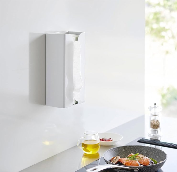 マグネットで“貼るだけ”設置の2 in 1ホルダー。前面スリットからポリ袋を1枚ずつサッと取り出せ、上部には薄型ティッシュやキッチンペーパーを載せて使えます。towerらしい清潔感のあるホワイトで、省スペースに“よく使う消耗品”の定位置づくりができます。